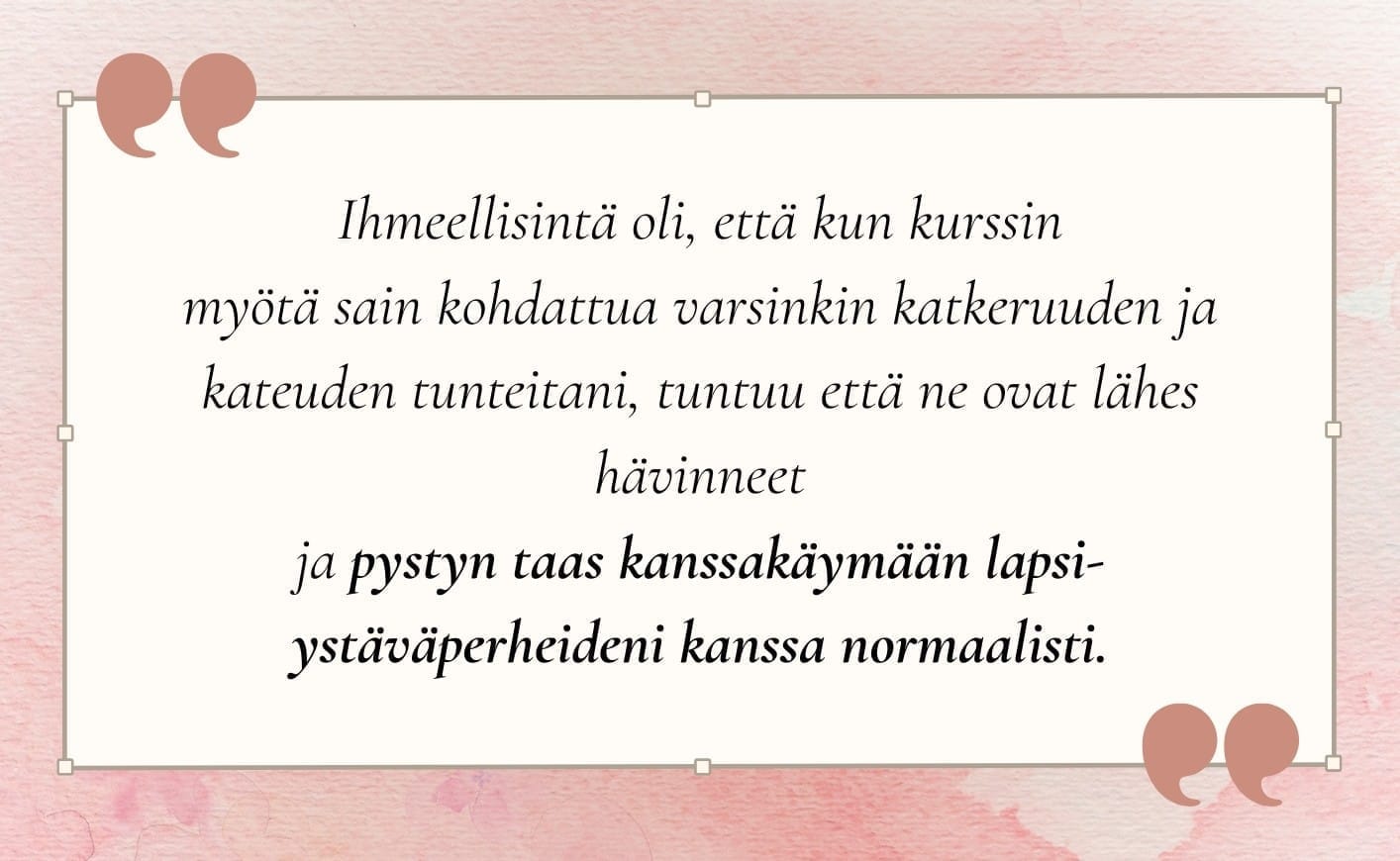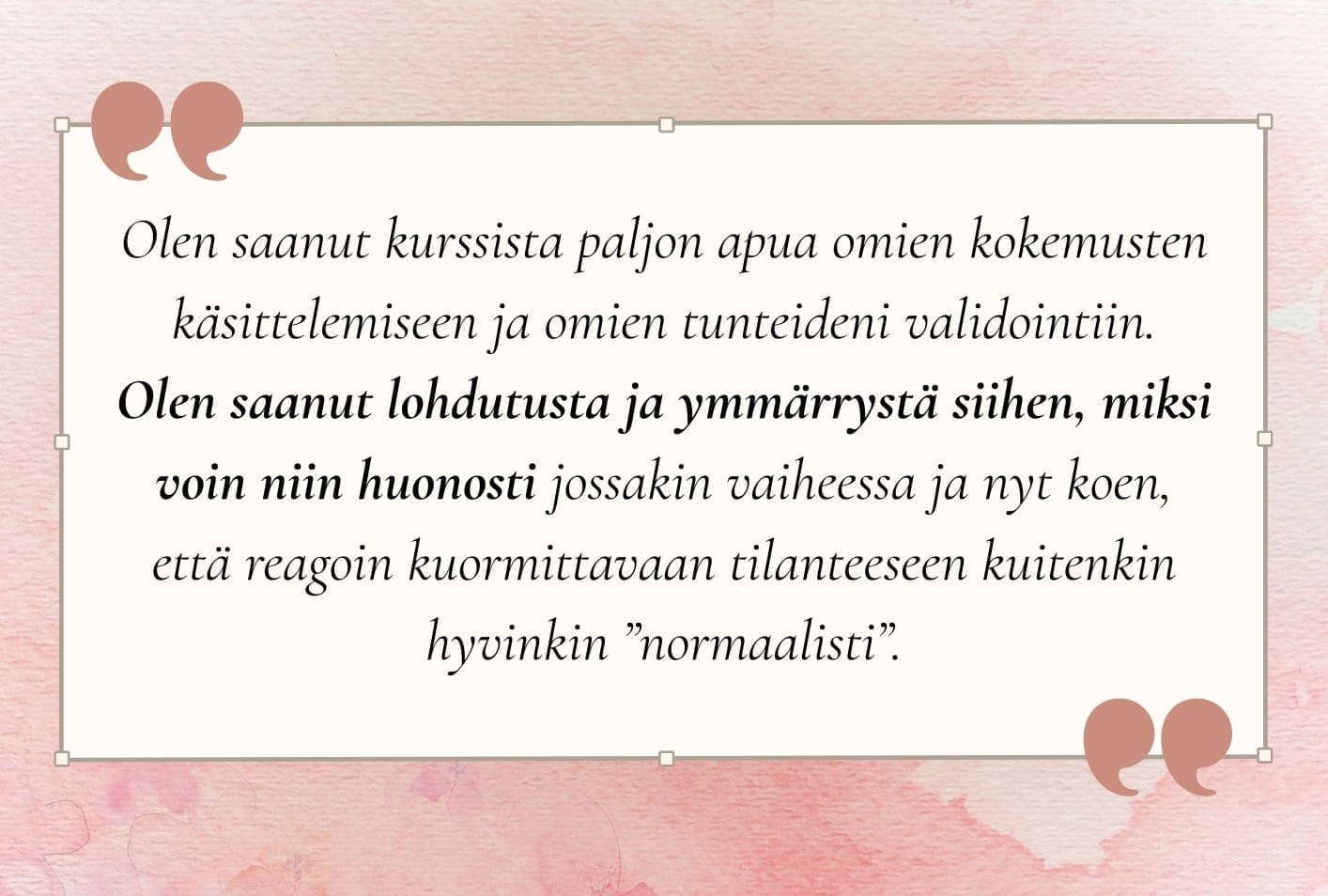 Olen saanut kurssista paljon apua omien kokemusten käsittelemiseen ja omien tunteideni validointiin.