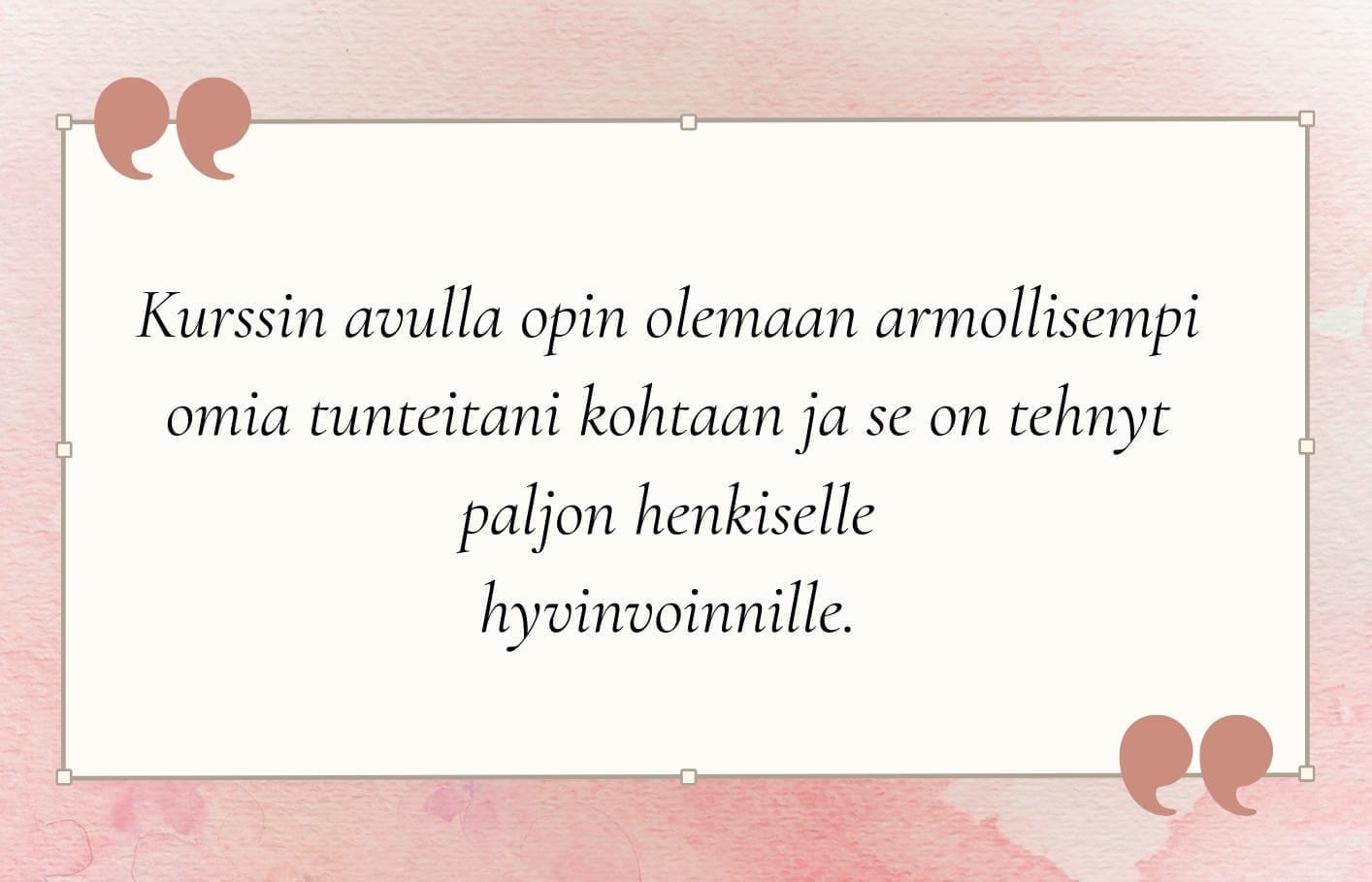 Mieleni oli kurssin jälkeen levollisempi, resilientimpi ja toiveikkaampi sen suhteen että selviän kaikesta mitä eteen tuleekin. Kurssi opetti tunnistamaan tunteita reaktioideni takana ja kuuntelemaan niitä.