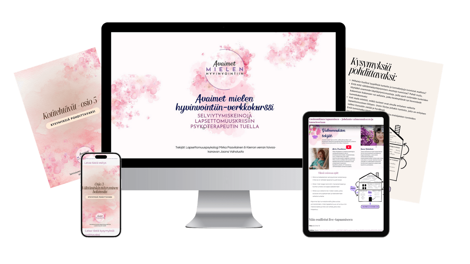 ✓ AVAIMET MIELEN HYVINVOINTIIN™-valmennusohjelma (arvo yli 300€) – lapsettomuuspsykologin kehittämä, viiden webinaarin ja lisämateriaalin avulla läpikäytävä oppimisprosessi